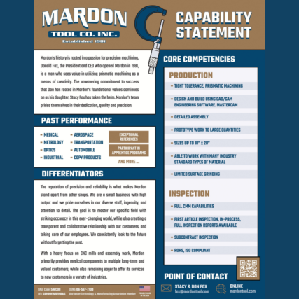 Mardon was established in 1981 by Donald Fox, whose passion for precision machining and belief in the creative potential of prismatic machining laid the foundation for the company’s success. Today, that same commitment to quality, innovation, and excellence continues under the leadership of his daughter, Stacy Fox, as she carries forward Mardon’s legacy with a forward-looking vision. The Mardon team takes great pride in their craftsmanship, delivering unmatched dedication, precision, and quality in every project.